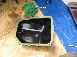 オイルパンと内部のマグネットを清掃し、新品のガスケットを載せATに取付ます。
