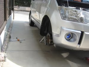 ジャッキアップして、リジッドラックに掛けてから右前タイヤを外します。