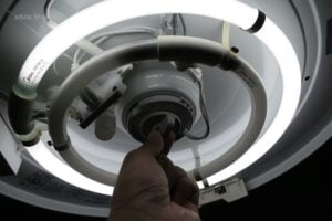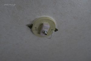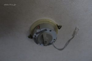 本当は明かりを消してからですが、配線コネクタを抜いて、中央の留め具を回すと本体が落ちてきます。