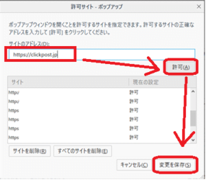 サイトのアドレス(D)に、「https://clickpost.jp」を記入し、「許可(A)」をクリック。